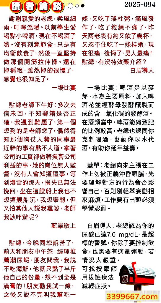 | 主题 :094期:彩民推荐〖貼信讀者論壇〗 |