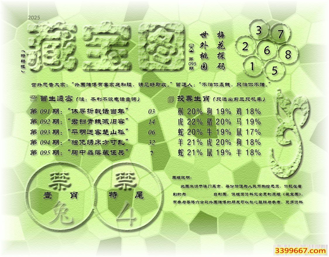 | 主题 :095期藏寶圖 新:碧落千门锁元气 老:胸中磊落藏伍兵 禁:兔 禁:4尾 |